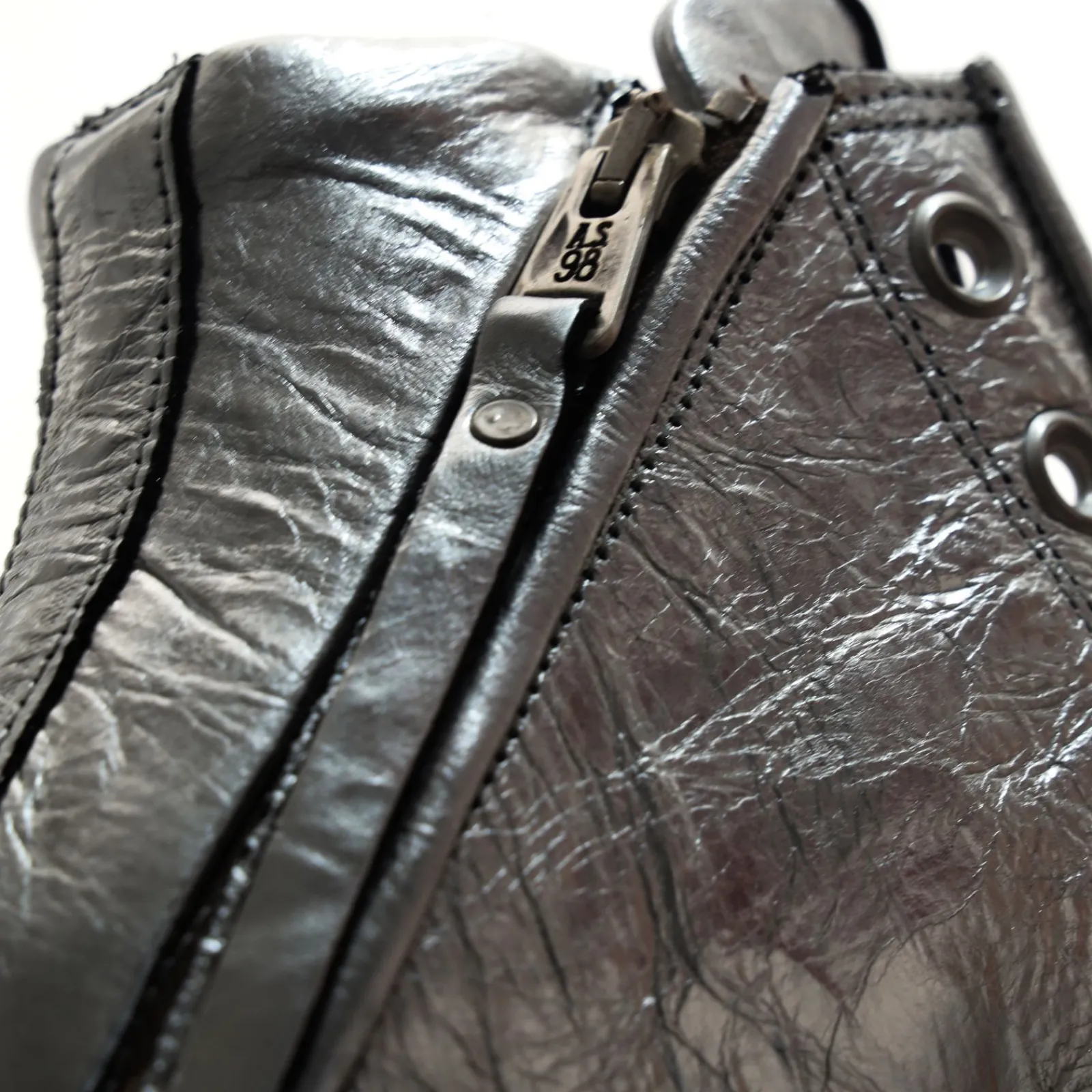 Die Turnschuhe der Linie AS Zeppa zeichnen sich durch Lederapplikationen, Verarbeitung aus Wildleder und eine abgerundete Kappe aus. Die Ausstanzungen an der Sohle heben sich farblich ab und machen den Schuh zu einem echten Turnschuh im Stil von A.S.98.