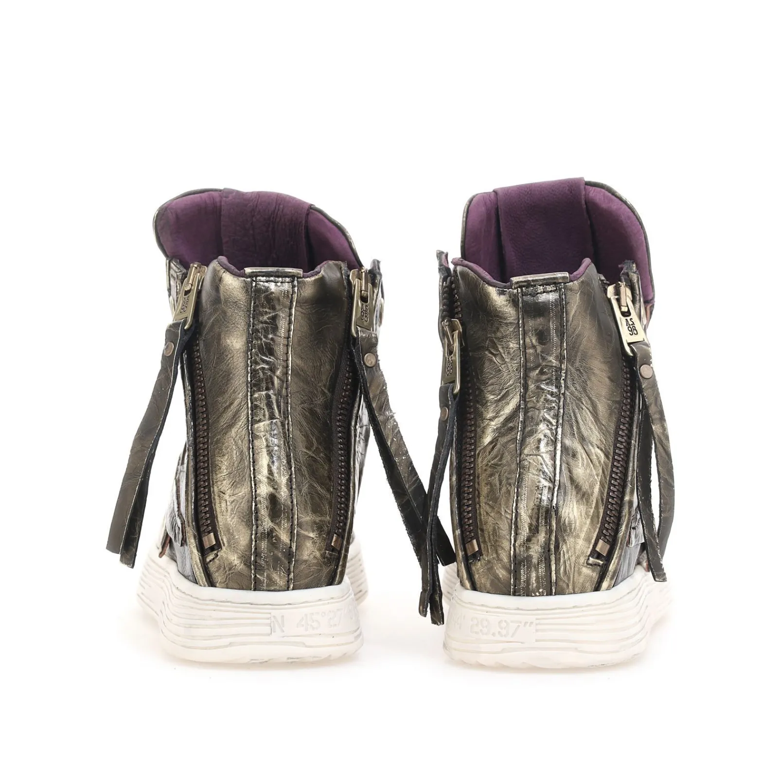 Die Turnschuhe der Linie AS Zeppa zeichnen sich durch Lederapplikationen, Verarbeitung aus Wildleder und eine abgerundete Kappe aus. Die Ausstanzungen an der Sohle heben sich farblich ab und machen den Schuh zu einem echten Turnschuh im Stil von A.S.98.